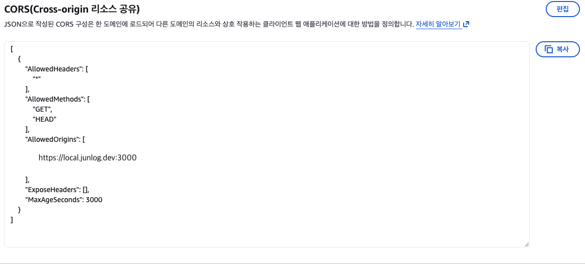 json[ { "AllowedHeaders": [ "*" ], "AllowedMethods": [ "GET", "HEAD" ], "AllowedOrigins": [ "https://local.junlog.dev:3000" ], "ExposeHeaders": [], "MaxAgeSeconds": 3000 } ]