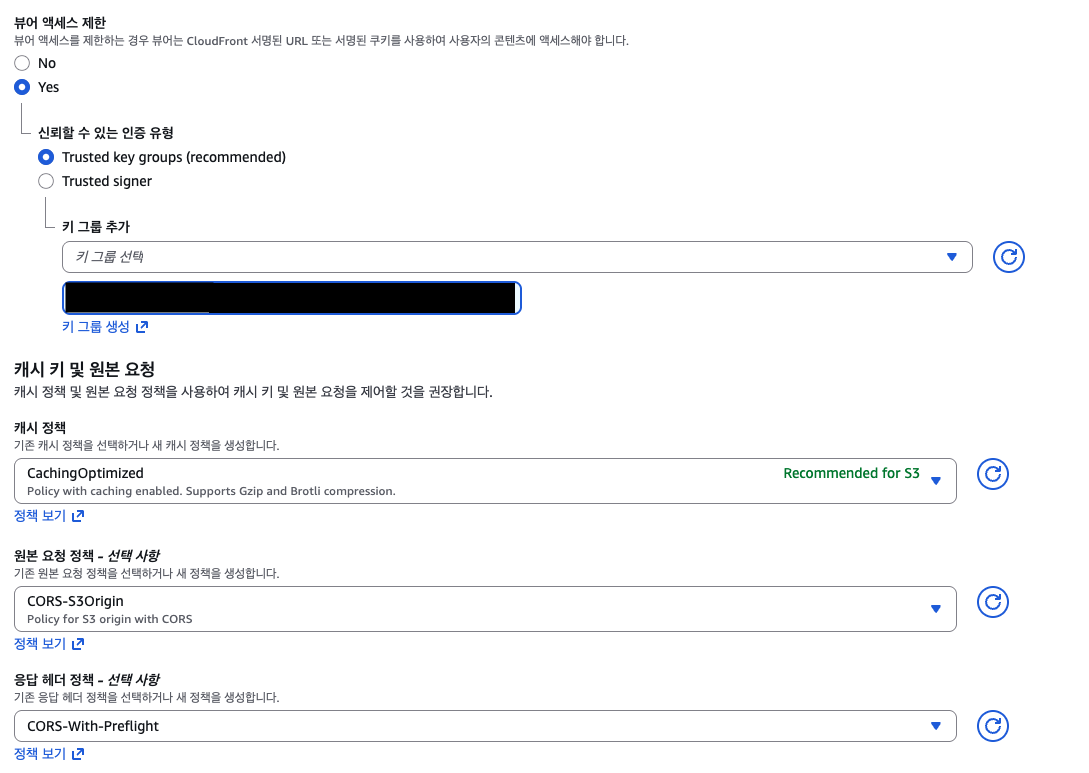 typescript// CloudFrontService @Injectable() export class CloudFrontService { private readonly domain = process.env.CLOUDFRONT_DOMAIN; private readonly keyPairId = process.env.CLOUDFRONT_KEY_PAIR_ID; private readonly privateKey = process.env.CLOUDFRONT_PRIVATE_KEY; async generateSignedCookies(basePath: string, expiresInMs: number = 100000) { // Use S3 + CloudFront Signed Cookies (All environments) const url = `${this.domain}/${basePath}/*`; const expiry = Math.floor((Date.now() + expiresInMs) / 1000); const policy = JSON.stringify({ Statement: [ { Resource: url, Condition: { DateLessThan: { 'AWS:EpochTime': expiry }, }, }, ], }); return getSignedCookies({ policy, keyPairId: this.keyPairId!, privateKey: this.privateKey!, }); } } // Service const expiresInMs = 100000; const cookies = await this.cloudFrontService.generateSignedCookies(basePath, expiresInMs); res.cookie('CloudFront-Policy', cookies['CloudFront-Policy'], { httpOnly: true, secure: true, sameSite: 'lax' as const, maxAge: expiresInMs, domain: '.junlog.dev', }); res.cookie('CloudFront-Signature', cookies['CloudFront-Signature'], { httpOnly: true, secure: true, sameSite: 'lax' as const, maxAge: expiresInMs, domain: '.junlog.dev', }); res.cookie('CloudFront-Key-Pair-Id', cookies['CloudFront-Key-Pair-Id'], { httpOnly: true, secure: true, sameSite: 'lax' as const, maxAge: expiresInMs, domain: '.junlog.dev', });