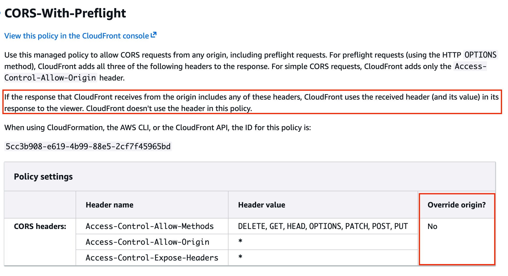In other words, by using the CORS settings provided by the S3 Bucket, the correct headers successfully reach the response.